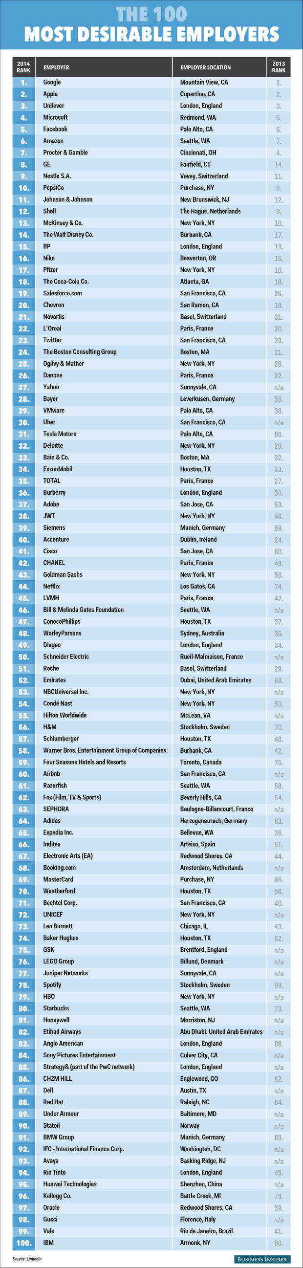 Δείτε στο παρακάτω Infographic του Business Insider τη λίστα με τις 100 πιο περιζήτητες εταιρίες για εργασία παγκοσμίως σύμφωνα με το LinkedIn.
