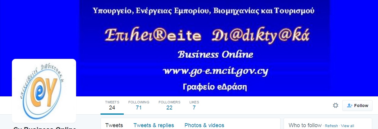 Στην δημιουργία λογαριασμού στο Twitter προχώρησε το Υπουργείο Ενέργειας, Εμπορίου, Βιομηχανίας και Τουρισμού, στα πλαίσια των αρμοδιοτήτων του για προώθηση του ηλεκτρονικού εμπορίου στην Κύπρο. Συγκεκριμένα, μέσω του λογαριασμού που φέρει την ονομασία “Cy Business Online” (@Go_e_mecit), το Υπουργείο Ενέργειας, Εμπορίου, Βιομηχανίας και Τουρισμού, στοχεύει στην καλύτερη ενημέρωση και επιμόρφωση των επιχειρήσεων των πολιτών και των καταναλωτών, για τη χρήση των τεχνολογιών πληροφορικής, επικοινωνιών και του ηλεκτρονικού εμπορίου.
