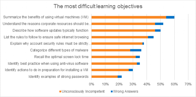 Οι πιο δύσκολοι μαθησιακοί στόχοι αποδείχτηκε ότι ήταν οι εικονικές μηχανές, οι ενημερώσεις και οι λόγοι για τους οποίους πρέπει να χρησιμοποιούν εταιρικούς πόρους πληροφορικής ακόμη και όταν εργάζονται εκτός γραφείου.