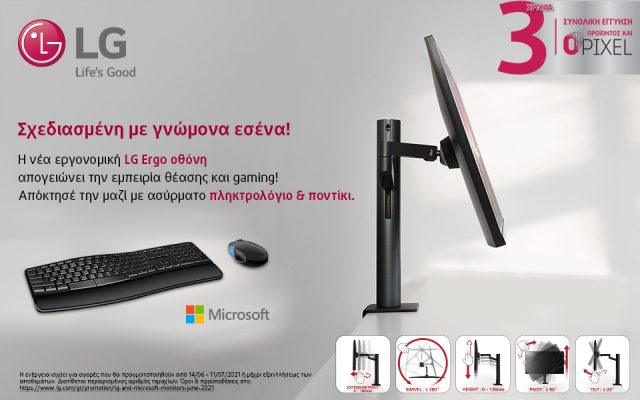 Μια νέα προωθητική ενέργεια υλοποιεί η LG Electronics (LG) δίνοντας τη δυνατότητα στους καταναλωτές να αποκτήσουν ένα ασύρματο πληκτρολόγιο και ποντίκι της Microsoft, με κάθε αγορά μιας νέας LG Ergo οθόνης από τις 14 Ιουνίου έως τις 11 Ιουλίου 2021[1]. Τα μοντέλα που συμμετέχουν στην ενέργεια είναι τα εξής: 32UN880, 27UN880, 27QN880, 34WN780, 27GN880, ξεχωρίζοντας για τον εργονομικό σχεδιασμό τους και τα προηγμένα χαρακτηριστικά τους.
