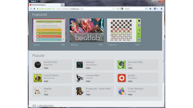 Ναι, καλά καταλάβατε, κανένα από τα δύο δεν βρίσκεται ακόμα στην τελική έκδοση του. Σε κάθε περίπτωση, μία πρώιμη έκδοση του Mozilla Marketplace βρίσκεται πλέον online. Για να αποκτήσετε πρόσβαση στη συγκεκριμένη υπηρεσία, πρέπει να έχετε εγκαταστήσει τη nightly έκδοση 16 του Firefox, ενώ αυτή τη στιγμή η τελική έκδοση του δημοφιλούς browser είναι η 13.