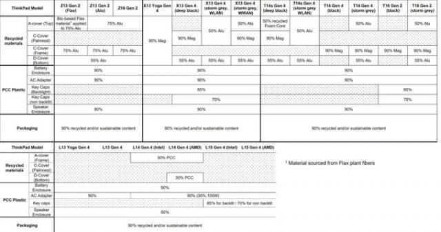 Ο παρακάτω πίνακας υπογραμμίζει τις συνεχείς προσπάθειες της Lenovo να εφαρμόσει πιο βιώσιμες πρακτικές στον σχεδιασμό και τη συσκευασία προϊόντων ThinkPad στα laptop ThinkPad που ανακοινώνονται σήμερα: