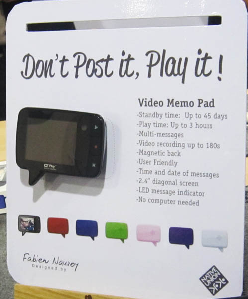 Εσείς ακόμη κολλάτε post-it στο ψυγείο; Η Native Union σάς προτείνει να εκσυχρονιστείτε με το Play, ένα video memo pad που παρουσίασε στο πλαίσιο της IFA 2011. Το Play διαθέτει τόσο βιντεοκάμερα, όσο και καταγραφέα ήχου, για να μπορεί να εγγράφει εικόνα και ήχο της επιλογής σας και, κατόπιν, να έχει τη δυνατότητα να τα αναπαράγει στην οθόνη των 2.4 ιντσών που διαθέτει, επιτρέποντάς σας να αυτοσχεδιάσετε δημιουργώντας τα πιο πρωτότυπα video-μηνύματα για τα αγαπημένα σας πρόσωπα. Μπορεί να αποθηκεύσει έως 3 λεπτά video σε ένα μήνυμα, διαθέτει μαγνητάκι για να μπορείτε να το τοποθετήσετε στο ψυγείο σας ή άλλη μεταλλική επιφάνεια, ενώ είναι ιδιαίτερα απλό στη χρήση με μόλις τρία πλήκτρα που εκτελούν όλες τις λειτουργίες! Έξυπνο και παιχνιδιάρικο gadget πραγματικά, που θα κοστίζει γύρω στα 60 ευρώ, ενώ θα είναι διαθέσιμο σε ποικιλία χρωμάτων.