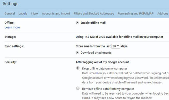Μπορείτε να έχετε πρόσβαση (εφόσον έχετε ενεργοποιήσει το νέο Gmail) από τα Settings (θα τα βρείτε κάνοντας κλικ στο εικονίδιο με το γρανάζι), όπου θα βρείτε τη νέα επιλογή offline. Τσεκάροντας το “Enable offline mail”, μπορείτε να παραμετροποιήσετε τα δεδομένα από το Gmail, στα οποία θα έχετε πρόσβαση από τη συσκευή σας και εκτός σύνδεσης. Μπορείτε να αποθηκεύσετε emails έως και 90 ημερών.