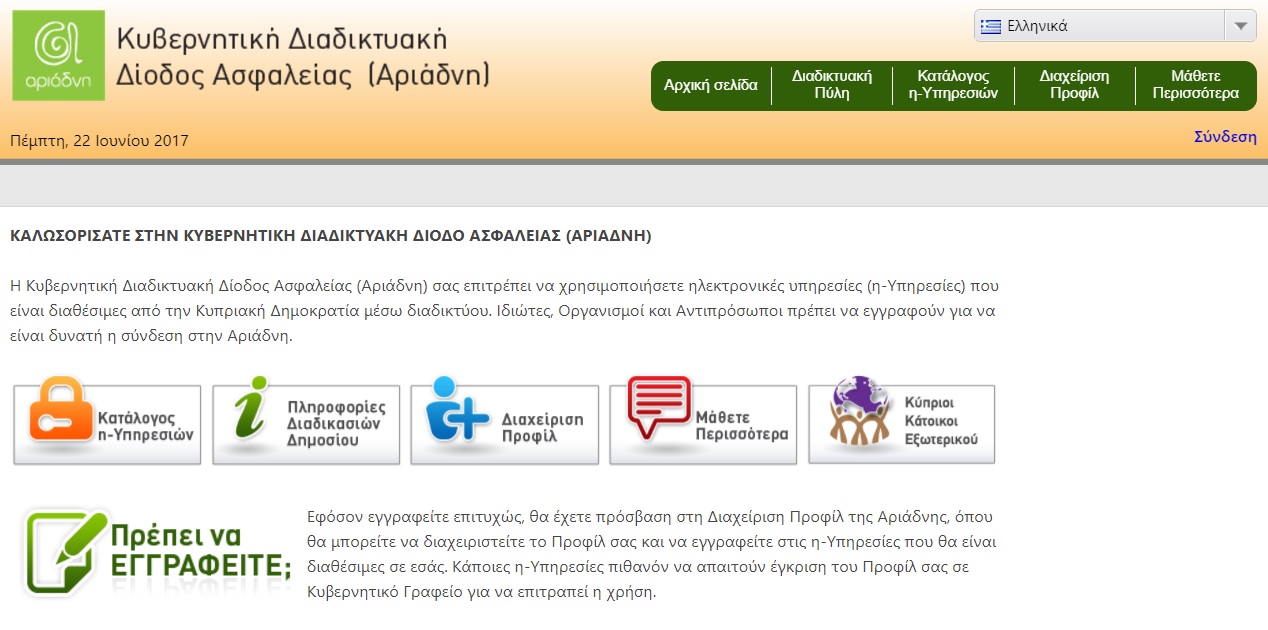 Απαραίτητη προϋπόθεση για πρόσβαση στην ηλεκτρονική υπηρεσία «Φορολογικά Στοιχεία» είναι, η εγγραφή στην Κυβερνητική Διαδικτυακή Δίοδο Ασφαλείας «Αριάδνη» (www.ariadne.gov.cy) η οποία προνοεί τον έλεγχο εγκυρότητας των προσωπικών σας στοιχείων και ενεργοποίηση των κωδικών σας ,μέσω των Κέντρων Εξυπηρέτησης του Πολίτη (Κ.Ε.Π.) Ακολούθως, μέσω της Κυβερνητικής Διαδικτυακής Διόδου Ασφαλείας «Αριάδνη» καταχωρείτε, όταν σας ζητηθεί, όνομα χρήστη και κωδικό πρόσβασης.