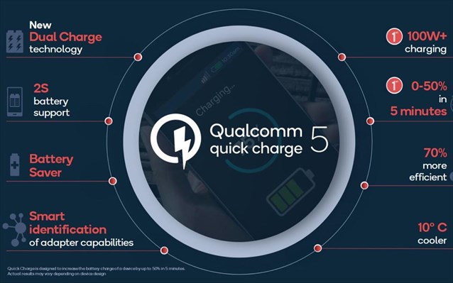 Μια νέα τεχνολογία ταχείας φόρτισης Quick Charging 5 (QC 5), ανακοίνωσε η Qualcomm. Σύμφωνα με την κατασκευάστρια εταιρεία το νέο πρότυπο επιτυγχάνει φόρτιση ενός τηλεφώνου με μπαταρία χωρητικότητας 4.500mAh από το 0 στο 50% σε χρόνο πέντε λεπτών, ενώ η πλήρης φόρτιση της μπαταριάς επιτυγχάνεται σε χρόνο δεκαπέντε λεπτών.