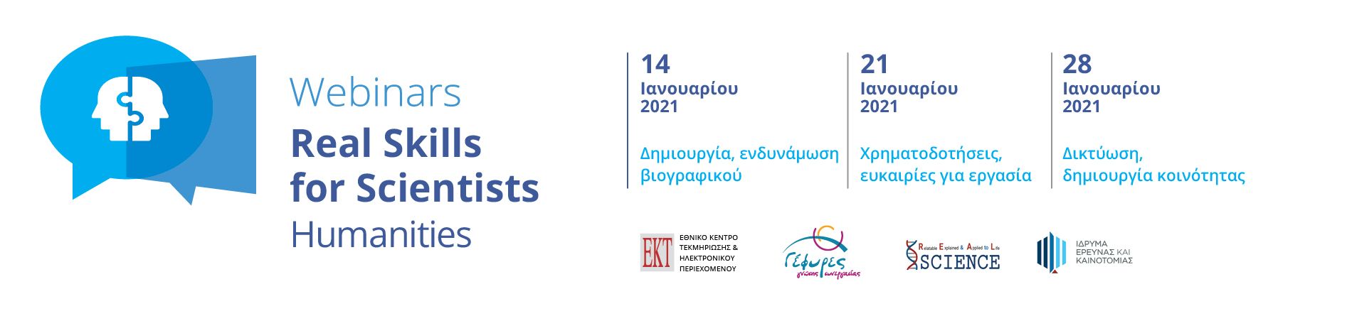 Ο νέος κύκλος των Διαδικτυακών Σεμιναρίων «Real Skills for Scientists» εστιάζει στο επιστημονικό πεδίο των Ανθρωπιστικών Επιστημών και αποτελείται από μια σειρά τριών διαδικτυακών σεμιναρίων στις εξής θεματικές: