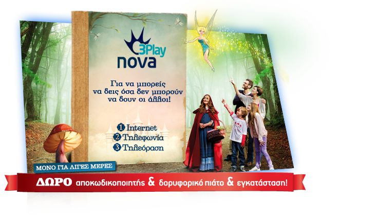 [Δ.Τ.] Η πιο οικονομική και ολοκληρωμένη υπηρεσία Nova 3Play που καλύπτει πλήρως τις ανάγκες όλης της οικογένειας για ποιοτική οικιακή ψυχαγωγία και αξιόπιστη επικοινωνία μόνο με 29,90€ το μήνα, διατίθεται με δώρο τον αποκωδικοποιητή, το δορυφορικό πιάτο και δωρεάν εγκατάσταση.