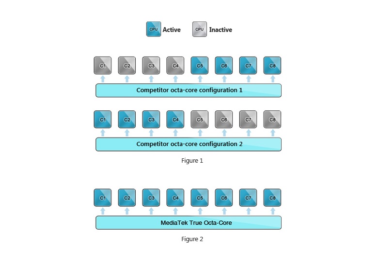 Και οι δύο προτάσεις βασίζονται στα γνωστά CPU clusters της αρχιτεκτονικής big.LITTLE της ARM, ωστόσο χάρη σε ένα ειδικό αλγόριθμο χρονοπραγματισμού, ο οποίος λαμβάνει υπόψη του μεταξύ άλλων την κατανάλωση και την θερμική συμπεριφορά, η λύση της MediaTek μπορεί και κατανέμει έξυπνα την επεξεργαστική ισχύ στο σύνολο των πυρήνων, με βάση τις απαιτήσεις του συστήματος.