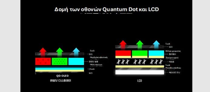 Οι οθόνες με Quantum Dots έχουν απλούστερη και πιο αποδοτική δομή σε σύγκριση με τις LCD. Οι οθόνες QLED της Samsung εξαλείφουν την ανάγκη για στρώμα φωσφόρου, καθώς το ίδιο το στρώμα QD, μαζί με το μπλε φως, συνδυάζονται για να ενισχύσουν τη φωτεινότητα και να αποδώσουν μεγαλύτερη ζωντάνια.