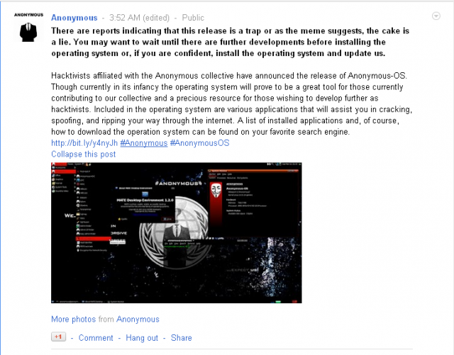 Εχθές σας γράψαμε για ένα νέο λειτουργικό, το Anonymous OS 1.0 που είναι διαθέσιμο για download. Είναι βασισμένο στο Ubuntu (Linux) και προσφέρει τη δυνατότητα ανώνυμης περιήγησης, αλλά και διαθέτει προεγκατεστημένες αρκετές χρήσιμες εφαρμογές.