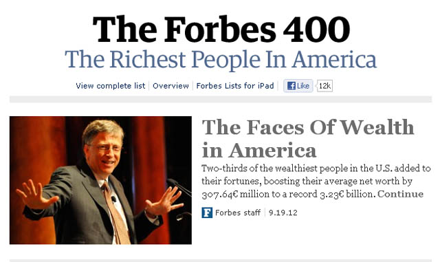 Το Forbes Magazine ανακοίνωσε χθες την ετήσια λίστα του, με τους πιο 400 πλούσιους Αμερικανούς, οι οποίοι, απ’ ό,τι φαίνεται, εν μέσω παγκόσμιας οικονομικής κρίσης, καταφέρνουν όχι μόνο να διατηρήσουν τις “δυνάμεις” τους, αλλά και να τις αυξήσουν.
