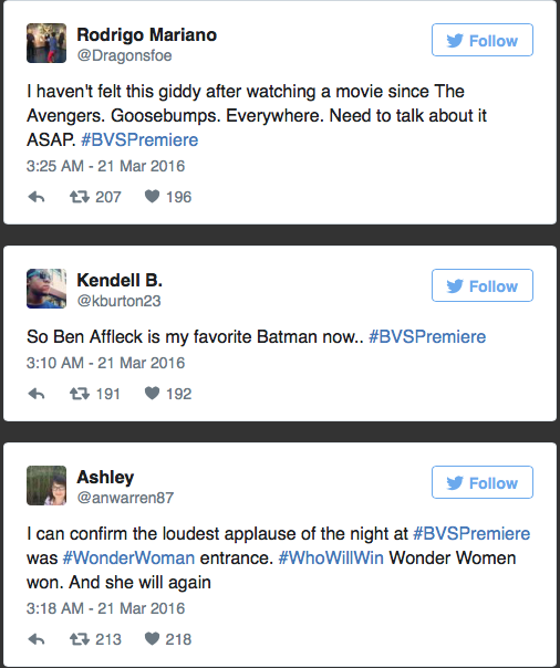 Αν και φυσικά υπάρχει αυστηρότατο εμπάργκο όσο αφορά τις κριτικές, οι σύντομες, σε μία φράση γνώμες έδωσαν μεγάλη τροφή στα social media. Και μπορεί από το ξεκίνημα η επιλογή του Ben Affleck ως Batman να μην είχε γίνει δεκτή με τα καλύτερα σχόλια, ωστόσο φαίνεται πως η ταινία είναι πολύ καλή και ο ρόλος του όχι μόνο δεν υστερεί, αλλά στέκεται στο ύψος του σούπερ ήρωα. Όπως μπορεί να δει κανείς παρακάτω, οι τυχεροί θεατές έγραψαν κάτι παραπάνω από θετικά για το τελικό αποτέλεσμα, και συνολικά για το έργο αλλά και για τις ερμηνείες ξεχωριστά. Μάλιστα αίσθηση προκαλεί πως αρκετοί αναφέρθηκαν στην παρουσία της Wonder Woman (Gal Gadot) που χειροκροτήθηκε από το κοινό και κατά τα λεγόμενα σχεδόν έκλεψε την παράσταση!