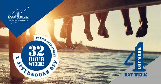 Μετά το υβριδικό και ευέλικτο μοντέλο εργασίας, ο Όμιλος MAP S.Platis εγκαινιάζει για το προσωπικό του και την 4-ήμερη εργασία μέσα από το πρόγραμμα «Summer afternoons» κατά την καλοκαιρινή περίοδο. Έτσι, για τους μήνες Ιούλιο και Αύγουστο, όλοι οι εργαζόμενοι στον συμβουλευτικό, εκπαιδευτικό και τεχνολογικό Όμιλο σε θέματα χρηματοοικονομικών υπηρεσιών και κανονιστικής συμμόρφωσης στην Κύπρο, θα απολαμβάνουν δύο απογευματινά ρεπό, και μάλιστα χωρίς καμία μείωση αποδοχών (θα έχουν τις ίδιες απολαβές και τα ίδια ωφελήματα). Το γεγονός αυτό σημαίνει στην ουσία 32ωρη εβδομάδα εργασίας, στη βάση της τυπικής 4-ήμερης εβδομάδας εργασίας.