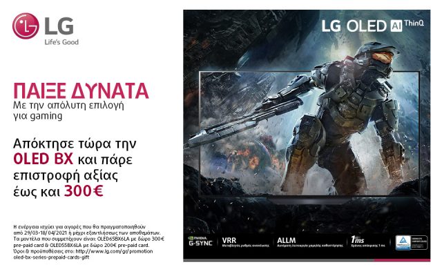 Η LG Electronics (LG) φέρνει την απόλυτη gaming εμπειρία μέσα από τη νέα προωθητική της ενέργεια, προσκαλώντας τους καταναλωτές να ‘παίξουν δυνατά’ τα αγαπημένα τους παιχνίδια με τα καλύτερα γραφικά σε μια LG OLED τηλεόραση. Συγκεκριμένα, με κάθε αγορά ενός μοντέλου τηλεόρασης OLED65BX6LA από τις 29/03 έως και τις 18/04/2021[1], η LG προσφέρει μια pre-paid card αξίας 300€, ενώ επιλέγοντας μια OLED55BX6LA, δίνεται δωροκάρτα αξίας 200€.