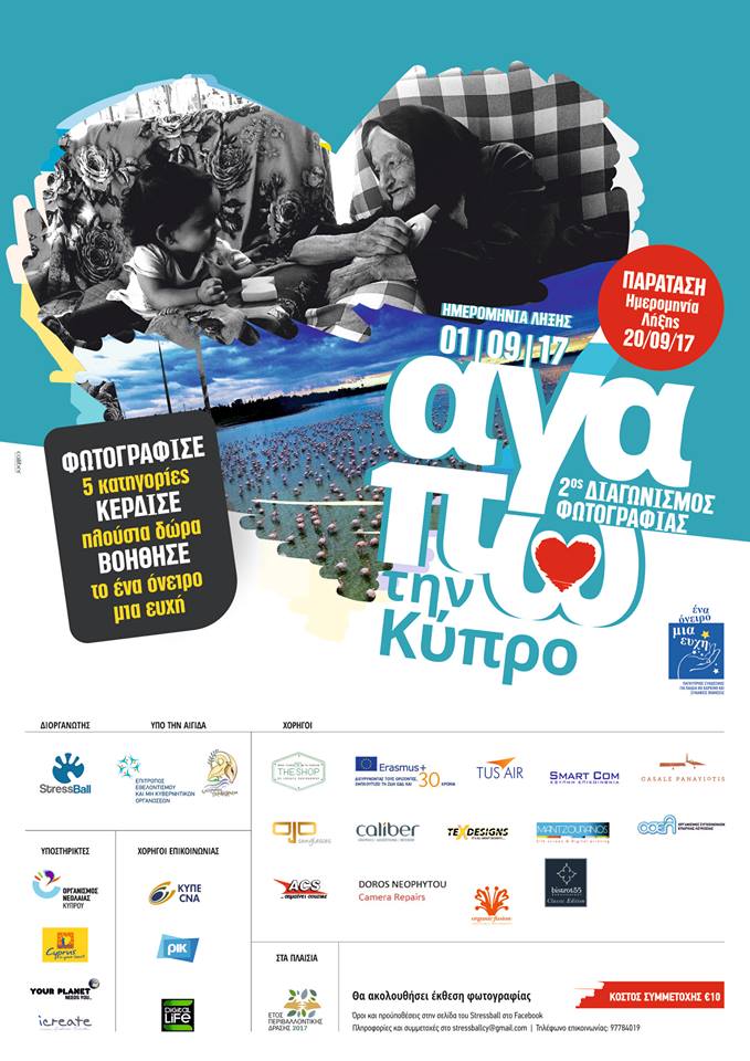 Παράταση μέχρι την Τετάρτη 20 Σεπτεμβρίου 2017 δόθηκε στο Παγκύπριο Διαγωνισμό Φωτογραφίας «Αγαπώ την Κύπρο» λόγω του ιδιαίτερα αυξημένου ενδιαφέροντος του κοινού να συμμετάσχει στον διαγωνισμό. Ο συγκεκριμένος διαγωνισμός διοργανώνεται για δεύτερη συνεχή χρονιά από τον οργανισμό Stressball, με στόχο να αναδείξει γνωστές και άγνωστες τοποθεσίες του νησιού, να ανασύρει στην επιφάνεια μέσα από τον φωτογραφικό φακό την ιστορικότητα της Κύπρου και τον φυσικό της πλούτο, το κράμα του παρελθόντος με το μέλλον.