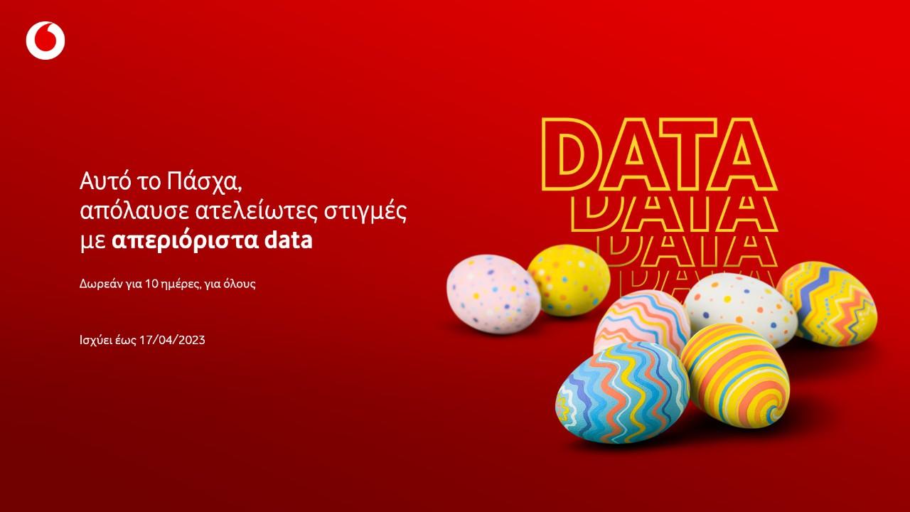 Φέτος το Πάσχα, η Vodafone προσφέρει δωρεάν απεριόριστα Data σε όλους τους συνδρομητές συμβολαίου και καρτοπρόγράμματος, εταιρικούς και οικιακούς, για 10 ημέρες, διευκολύνοντας την επικοινωνία και την ψυχαγωγία τις ημέρες των γιορτών.