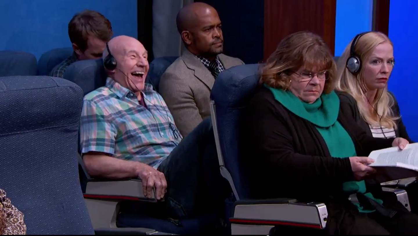 Ο Jimmy Kimmel παρουσίασε στο show του μία έρευνα που συγκέντρωσε τις χειρότερες περιπτώσεις, που, για κακή σου τύχη, μπορείς να πετύχεις σ’ ένα αεροπλάνο και σκέφτηκε να αναπαραστήσει όλους αυτούς τους περίεργους τύπους που χωρίζονται ανά κατηγορία. Ε και φυσικά “έτυχε” να έχει στο στούντιο τον εκπληκτικό Sir Patrick Stewart, για να τον βοηθήσει να γίνει το επιχείρημα ακόμα πιο “γραφικό” και να νιώσουμε τον “πόνο” του συνεπιβάτη.
