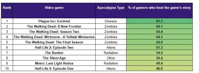 Το Slottracker.com αποκάλυψε ότι είναι πιο πιθανό να επιβιώναμε σε ένα αποκαλυπτικό μέλλον με ασθένειες, αφού το 50,3% των παικτών, κατά μέσο όρο, ξεπέρασε αυτό το… πρόβλημα. Πρόκειται για το υψηλότερο ποσοστό μεταξύ όλων των «αποκαλυπτικών» τύπων παιχνιδιών που εξετάστηκαν. Οι παίκτες χρειάστηκαν λίγο περισσότερο από 19 ώρες για να επιβιώσουν. Ένα μέλλον με τρομακτικά τέρατα είναι το δεύτερο πιθανό σενάριο που νιώθουμε μια σχετική αυτοπεποίθηση ότι θα επιβιώσουμε, με ένα ποσοστό 39,0% των παικτών να ολοκληρώνουν αυτό το είδος παιχνιδιού. Αντίθετα, μεγάλοι εχθροί της ανθρωπότητας αναδείχθηκαν τα zombies, με ποσοστό ολοκλήρωσης μόλις 29.9%.