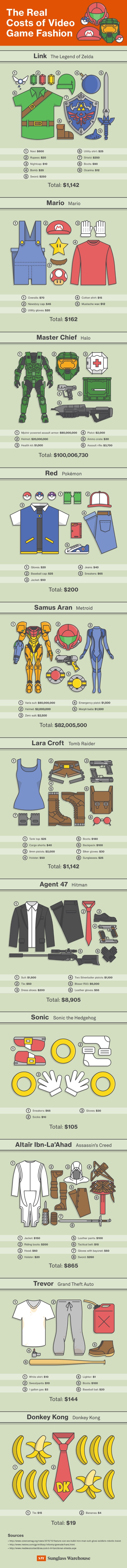 Παρακάτω θα δείτε την έρευνα που παρουσίασε η Sunglass Warehouse, η οποία υπολόγισε το κόστος των ρούχων διάφορων χαρακτήρων από videogames. Η ομάδα προσπάθησε να εντοπίσει αληθινά αντικείμενα για να αντικαταστήσει τον εξοπλισμό, όπως για παράδειγμα το Navi του Link (ένα drone) και να χρησιμοποιήσει αληθινά project, όπως το Tactical Assault Light Operator Suit (TALOS) για τον Master Chief για να το προσαρμόσει με κάποιο τρόπο στα οικονομικά μας μοντέλα, και το παντελόνι ενός τύπου από το Grand Theft Auto που στοιχίζει 144 δολάρια.