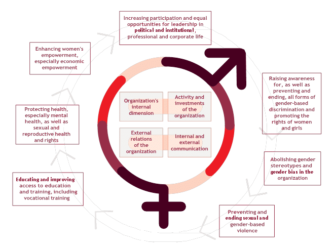 - Την εφαρμογή πλαισίου, διαθέσιμων πόρων, πολιτικών, εργαλείων και καλών πρακτικών προώθησης και εφαρμογής της ισότητας των φύλων.