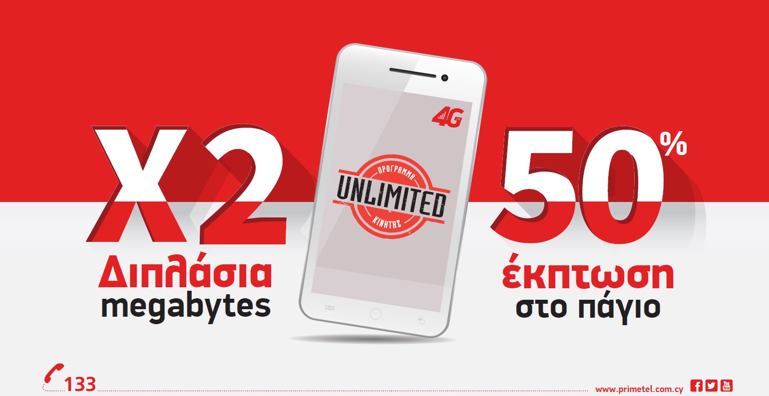 Περισσότερο διαδικτυακό σερφάρισμα από κινητό με διπλάσια megabytes και έκπτωση στο κόστος του μηνιαίο παγίου, περιλαμβάνει η νέα προσφορά που ανακοίνωσε πρόσφατα PrimeTel. Συγκεκριμένα, με τη νέα αυτή προσφορά, παρέχεται η δυνατότητα σε όσους μεταφέρουν τον αριθμό τους σε οποιοδήποτε πρόγραμμα κινητής unlimited της PrimeTel, να έχουν κάθε μήνα και για περίοδο ενός έτους διπλάσια megabytes mobile internet, ενώ επιπρόσθετα θα τους παραχωρείται 50% έκπτωση στο μηνιαίο τους πάγιο για όλη τη διάρκεια του συμβολαίου τους.