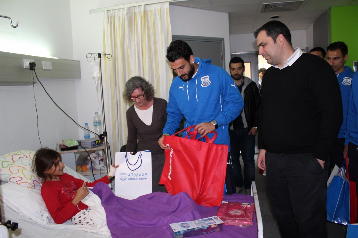 Επίσκεψη στο Παιδιατρικό Τμήμα του Γενικού Νοσοκομείου Λεμεσού πραγματοποίησαν η PrimeTel και οι ποδοσφαιριστές του Απόλλωνα. Συγκεκριμένα, οι ποδοσφαιριστές του Απόλλωνα και το Τμήμα Δημοσίων Σχέσεων της PrimeTel, επισκέφτηκαν τους θαλάμους οπού νοσηλεύονται οι μικροί σε ηλικία ασθενείς και ενημερώθηκαν από τους συνοδούς των παιδιών, αλλά και τα ίδια τα παιδιά, για την κατάσταση της υγείας τους, δίνοντας τους κουράγιο και ευχές για γρήγορη ανάρρωση. Για αρκετή ώρα οι “κυανόλευκοι” άσοι μοίρασαν χαρά στα παιδιά και έβαλαν στα προσωπάκια τους πλατιά χαμόγελα, που περίμεναν με αγωνία τα δωράκια που τους προσφέρθηκαν. Οι ποδοσφαιριστές της ομάδας της Λεμεσού και τα στελέχη της PrimeTel, έδειχναν ιδιαίτερα συγκινημένοι από την αγάπη που εισέπρατταν σε κάθε τους βήμα μέσα στον χώρο του Νοσοκομείου. Ευχήθηκαν από καρδιάς, Καλά Χριστούγεννα Καλή Χρόνια και Καλή ανάρρωση στα παιδιά, στις οικογένειες τους αλλά και στο Νοσηλευτικό Προσωπικό και τους Γιατρούς του νοσοκομείου.
