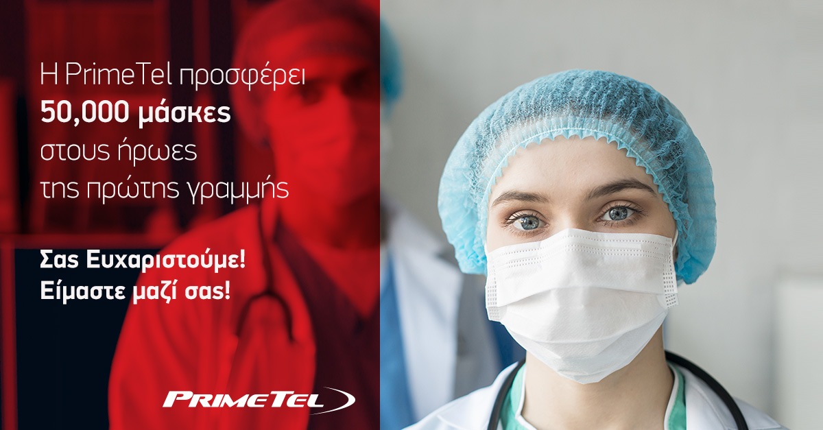 Η PrimeTel με αίσθημα ευθύνης προς το κοινωνικό σύνολο, στηρίζει έμπρακτα τις ανάγκες του Γενικού Συστήματος Υγείας και το έργο των υγειονομικών αρχών στην αντιμετώπιση της πανδημίας, προσφέροντας 50,000 προστατευτικές μάσκες με στόχο να βοηθήσει στη μάχη ενάντια στον ιό.