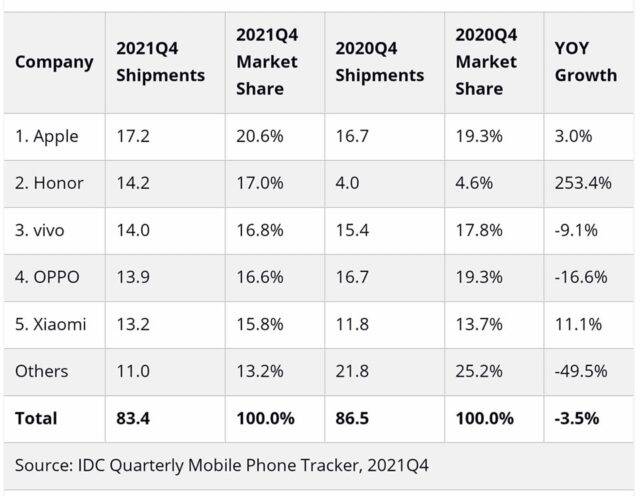 Η IDC δημοσίευσε την τριμηνιαία έκθεση της για την αγορά smartphone, η οποία αναφέρει ότι η HONOR ξεπέρασε τους στόχους της και έκανε ρεκόρ αποστολών το 4ο τρίμηνο του 2021 ενώ συνέχισε την ανάπτυξή της σημειώνοντας ετήσια αύξηση 253,4% στην κινεζική αγορά και έγινε ο 2ος κατασκευαστής smartphone και ο πρώτος Android smartphone κατασκευαστής στην Κίνα με περισσότερες από 14,2 εκατομμύρια αποστολές. Οι ετήσιες αποστολές smartphone της HONOR έφτασαν τις 38,6 εκατομμύρια συσκευές, μια σημαντική αύξηση σε σύγκριση με το 2020, γεγονός που έφερε την HONOR στους TOP 5 κατασκευαστές smartphone.