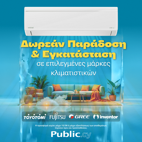 Γι περισσότερες πληροφορίες επισκεφθείτε ένα από τα φυσικά καταστήματα Public ή το public.cy, και επιλέξτε ανάμεσα σε μια ευρεία γκάμα κλιματιστικών, με την υποστήριξη του εξειδικευμένου προσωπικού και την αξιοπιστία που χαρακτηρίζει κάθε εμπειρία αγοράς στα Public!