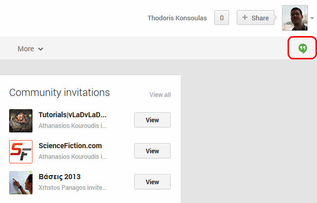 Το chat του Google+ απέκτησε νέο εικονίδιο και νέα ονομασία, την Hangouts. Πατώντας το εικονίδιο πάνω δεξιά στο Google+, μπορείτε να εμφανίζετε το chat. Τι έχει το νέο chat να μας δείξει;
