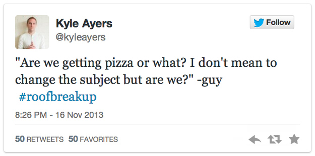 Τα highlights του #roofbreakup ήταν πολλά όπως φρόντισε ωστόσο να ενημερώσει τους ακολούθους του ο ίδιος ο Ayers ο άντρας δεν σταμάτησε να ρωτάει, σε διάφορες φάσεις του τσακωμού, αν τελικά θα παράγγελναν πίτσα. Φιλική συμβουλή προς τη γυναίκα: Μα, πας να βρεις το δίκιο σου όταν ο άντρας είναι με άδειο το στομάχι;