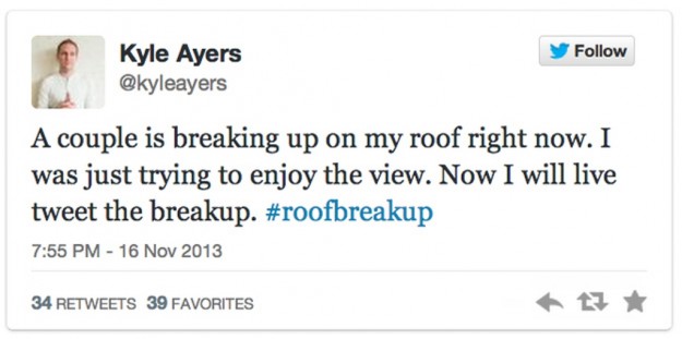 Ο Ayers αποφάσισε στιγμιαία να καταγράψει «ζωντανά» το ερωτικό καβγαδάκι μέσω Twitter και να το κοινοποιήσει στους 5000 ακολούθους του δημιουργώντας παράλληλα το hashtag #roofbreakup το οποίο έγινε viral.