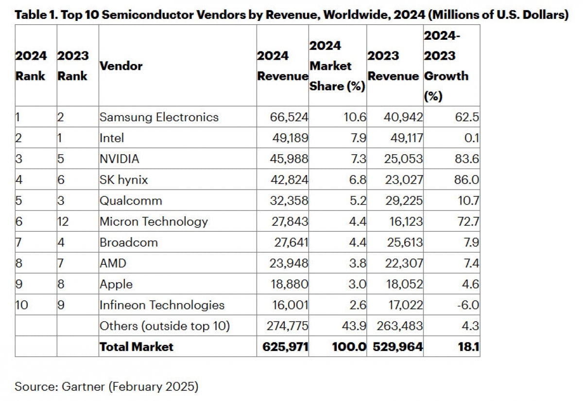 Η Samsung ανέκτησε την κορυφή ως ο μεγαλύτερος κατασκευαστής ημιαγωγών στον κόσμο το 2024, ξεπερνώντας την Intel, η οποία είχε ηγηθεί της αγοράς το 2023. Η κορεατική εταιρεία κατέγραψε μερίδιο αγοράς 10,5% και συνολικά έσοδα 66,5 δισεκατομμυρίων δολαρίων, σημειώνοντας αύξηση 62,5% στις αποστολές σε ετήσια βάση. Η ανοδική της πορεία αποδίδεται κυρίως στην ανάκαμψη των τιμών των μνημών, που αποτελούν έναν από τους βασικούς τομείς δραστηριότητάς της.