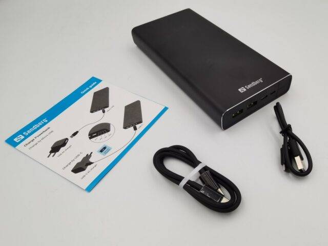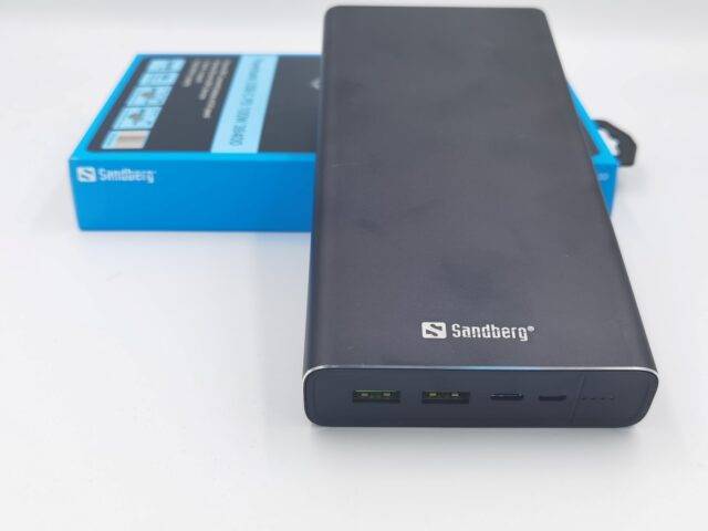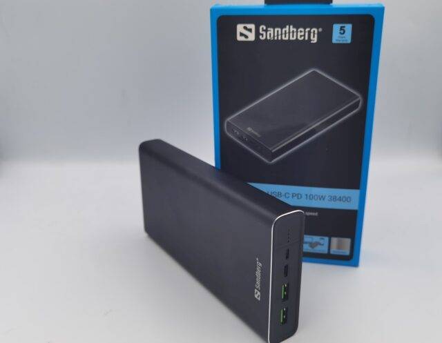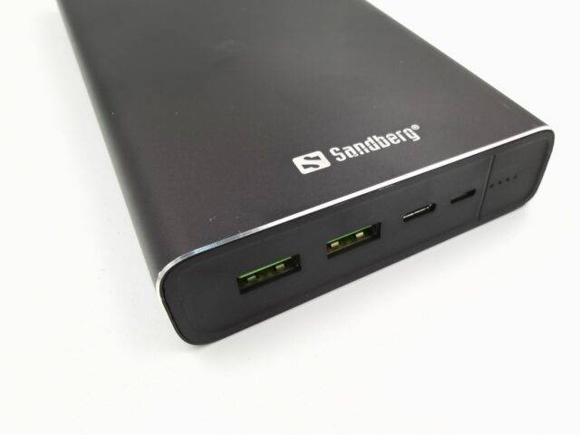 Η πρόταση της Sandberg διαθέτει 2 θύρες USB-A, μία θύρα USB-C και μια micro USB (2 inputs και 3 outputs), και μπορεί να φορτίσει μία συσκευή με έως και 5Α (input και output στα 100W). Με χωρητικότητα που αγγίζει τα 38.400mAh, το εν λόγω powerbank ξεχωρίζει για την ποιότητα κατασκευής που προσφέρει, καθώς είναι κατασκευασμένο από αλουμίνιο. Δίπλα από τα ports υπάρχουν τέσσερα μικρά LED τα οποία σας ενημερώνουν για την διαθέσιμη ενέργεια του powerbank σας (στο 25, 50, 75 και 100%).
