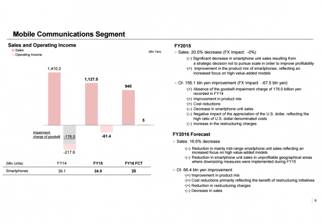 Η Ιαπωνική εταιρία αναφέρει οτι η πτώση οφείλεται στην μείωση των πωλήσεων των mid-range smartphones και την εστίαση του κοινού σε high-end συσκευές (που είναι και πιο ακριβές όμως). Η πτώση οφείλεται επίσης και στην αδυναμία να έχουν κέρδη από προβληματικές γεωγραφικές περιοχές του κόσμου, στις οποίες αναγκάστηκε η εταιρία να κάνει περικοπές.