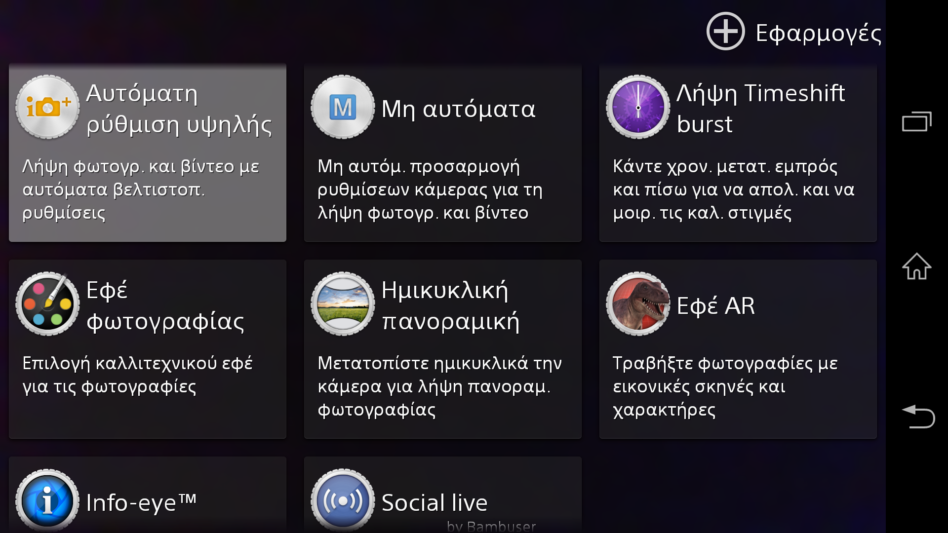 Το λογισμικό επίσης προσφέρει πέρα από τις λειτουργίες Superior Auto και Manual, Λήψη Timeshift burst (τραβάει 60 φωτογραφίες σε ένα… πάτημα του κλείστρου), Εφέ φωτογραφίας, Ημικυκλική πανοραμική λήψη, Εφέ Επαυξημένης πραγματικότητας καθώς και τις λειτουργίες Info-Eye (σας επιτρέπει να τραβάτε φωτογραφίες τοπίων ή αξιοθέατων, ετικετών ή απλού κειμένου και σας παρέχει πληροφορίες σχετικά με το θέμα της λήψης σας) και Social Live, με την βοήθεια του οποία σας επιτρέπει να προβάλλετε σε πραγματικό χρόνο στο προφίλ σας στο Facebook το video που τραβάτε, την στιγμή που το τραβάτε (ότι πρέπει για… συναυλίες!).