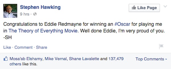 Μία νίκη που το μεγαλύτερο μυαλό της εποχής μας δεν την άφησε να περάσει έτσι, αφού φρόντισε να συγχαρεί τον Redmayne μέσα από την σελίδα του στο Facebook. “Είμαι πολύ περήφανος για σένα” θα πει ο Hawking, δίνοντας ίσως το σημαντικότερο μπράβο στον ηθοποιό, που όταν παρέλαβε το Όσκαρ δεν ξέχασε φυσικά να ευχαριστήσει όλη την οικογένεια Hawking, αλλά και να στείλει ένα μήνυμα συμπαράστασης σε όλους όσους παλεύουν με την ασθένεια ALS.