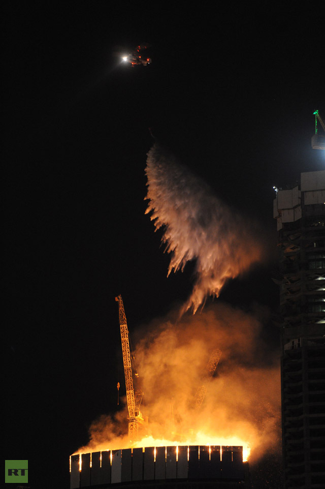 Η φωτιά που καίει σε 300 περίπου τ.μ. του κτιρίου έχει ως αποτέλεσμα να απομακρυνθούν εργαζόμενοι από τον ουρανοξύστη, που βρίσκεται στο επιχειρηματικό κέντρο της πόλης. Έχει ξεσπάσει στον 67ο όροφο (250 μέτρα από το έδαφος) και έχει επεκταθεί, όπως φαίνεται, και σε σημεία του 66ου και του 65ου ορόφου.