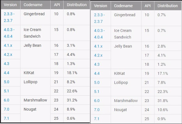 Ωστόσο, το Android 6.0 Marshmallow συνεχίζει και αυτό την άνοδό του, παρ’ότι βρισκόμαστε λίγο πριν την έλευση του Android O. Από το 31,2% του Ιουνίου το Marshmallow έφθασε στο 31,8% του Ιουλίου, αν και θα σταθεροποιηθεί, αναμενόμενα, τους επόμενους μήνες, πριν αρχίσει σταδιακά να μειώνεται το ποσοστό του.