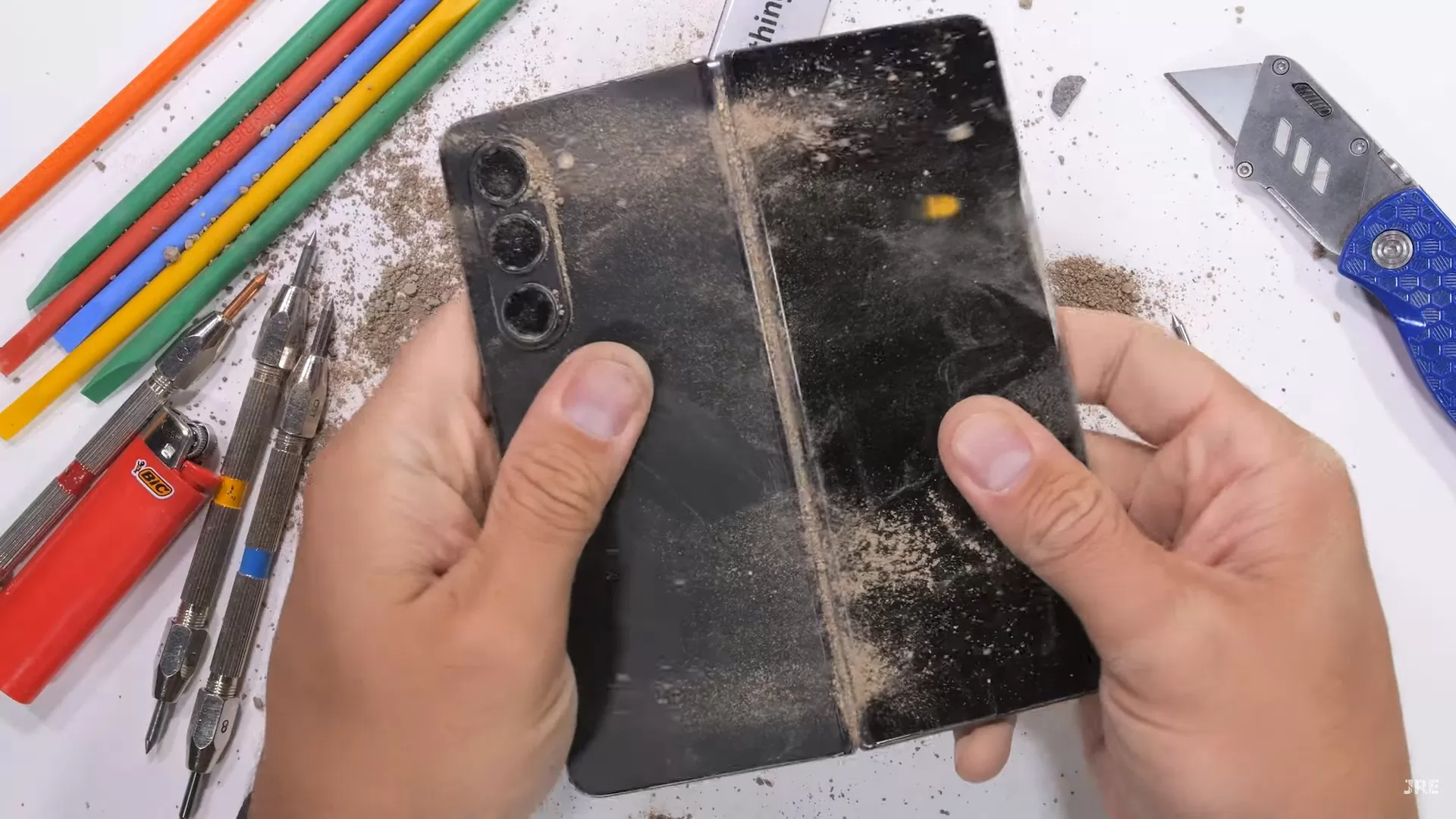 Έτσι λοιπόν στο τελευταίο του video, στο οποίο υποβάλλει το Z Fold5 σε μια σειρά από φρικτά βασανιστήρια (ναι είναι ένα smartphone που κοστίζει πάνω από… 1500 ευρώ οπότε πονάμε), τον βλέπουμε να περνάει το νέο αναδιπλούμενο της κορεατικής εταιρείας από μια σειρά από test που θα «λύγιζαν» ακόμη και τους πιο «δυνατούς»… όχι όμως όπως όλα δείχνουν το Fold5. Έτσι λοιπόν ο γνωστός YouTuber αφού πρώτα ασκεί υπερβολική πίεση για να το λυγίσει στη συνέχεια γρατζουνάει την εσωτερική και εξωτερική οθόνη, ενώ παράλληλα φροντίζει να το κάψει (Ω θεοί…. τι κάνει ο αθεόφοβος) και δεν παραλείπει να το πετάξει μέσα σε σκόνη, άμμο και βρωμιά. Αυτός σίγουρα δεν είναι τρόπος να «συμπεριφέρεσαι» σε ένα premium high-end foldable όπως το Galaxy Z Fold5 της Samsung, ωστόσο το νέο foldable αποδείχθηκε πολύ σκληρό για να πεθάνει. Δείτε το video των βασανιστηρίων του foldable της Samsung (εάν το… αντέχετε) και dont try this at home!