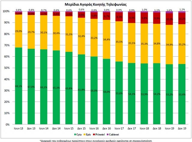 Σχεδόν αμετάβλητα παρέμειναν τα μερίδια αγοράς κινητής τηλεφωνίας το 2ο εξάμηνο του 2019. Παρά τον έντονο ανταγωνισμό μεταξύ των τηλεπικοινωνιακών παρόχων, οι αριθμοί δείχνουν ότι η αγορά περιορίζεται στην μετακίνηση των ήδη υπαρχόντων πελατών κι όχι στην εγγραφή νέων συνδρομητών.