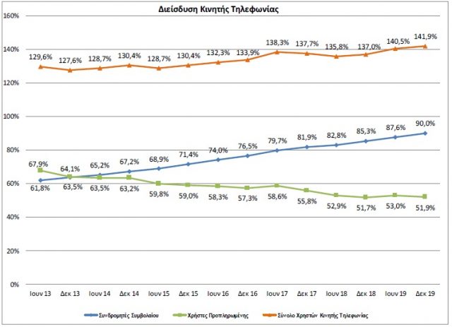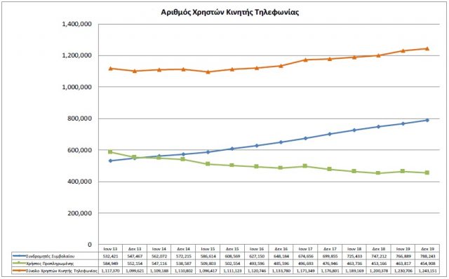 Ο συνολικός αριθμός των χρηστών κινητής τηλεφωνίας το 2ο εξάμηνο του 2019 παρουσίασε αύξηση κατά 12,445 χρήστες και ανήλθε στο τέλος Δεκεμβρίου 2019 στο 1,243,151 χρήστες σε σχέση με το 1,230,706 που ήταν στο τέλος Ιουνίου 2019, γεγονός που οφείλεται κυρίως στην αύξηση των συνδρομητών συμβολαίου. Αντίθετη πορεία ακολούθησε ο συνολικός αριθμός των χρηστών προπληρωμένης κινητής τηλεφωνίας ο οποίος περιορίστηκε στο τέλος του 2019 στις 454,908 σε σύγκριση με τις 463,817 που ήταν τον Ιούνιο του 2019.