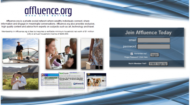 Στo Affluence.org μπορείτε να μπείτε εάν: 1) Έχετε καθαρό εισόδημα μεγαλύτερο του 1 εκατομμυρίου δολαρίων 2) Έχετε πρόσκληση από ένα μέλος 3) Σας προτείνουν 5 μέλη. Τι κερδίζετε; Λοιπόν, εφόσον έχετε ένα σκασμό λεφτά όπως και τα υπόλοιπα μέλη του συγκεκριμένου κοινωνικού δικτύου, σίγουρα θα ασχολείστε με φιλανθρωπίες. Οι εκάστοτε φιλανθρωπίες που υποστηρίζετε, θα προβληθούν μέσα από το Affluence.org, οπότε έχετε και αυξημένες πιθανότητες να βρείτε κι άλλους που θα συνεισφέρουν γενναιόδωρα σε αυτές, αλλά και παράλληλα κερδίζετε και συστάσεις ή προσκλήσεις για exclusive events, ξεναγήσεις πόλεων που επιθυμείτε να επισκεφτείτε αλλά και 24ωρη βοήθεια. Σημειώστε πως ο μέσος όρος του εισοδήματος που δηλώνουν τα μέλη του Affluence.org είναι τα 32,7 εκατομμύρια δολάρια.
