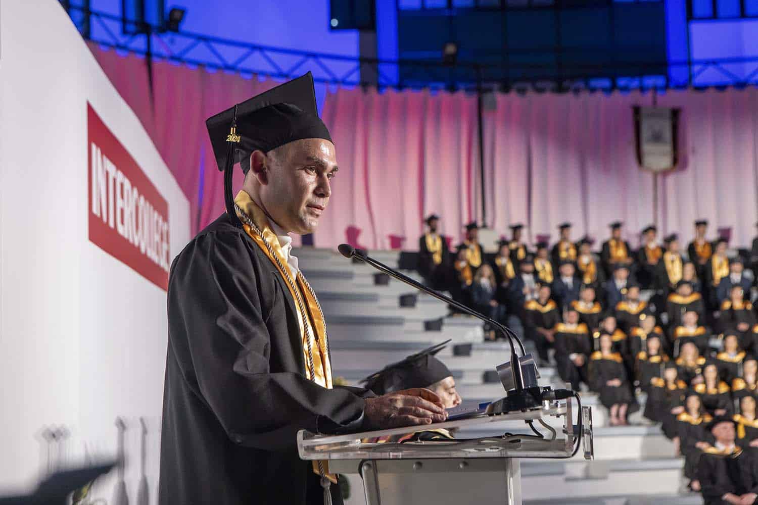 Ο Κωνσταντίνος Ξενοφώντος, απόφοιτος του προγράμματος Δίπλωμα «Μηχανική Αυτοκινήτου» του Intercollege στο δικό του χαιρετισμό είπε: «Οι αγωνίες μας, οι ώρες διαβάσματος, οι εργασίες, οι προθεσμίες τους, η σκληρή δουλειά αλλά και όλοι οι κόποι αυτών των ετών ήρθε πλέον η ώρα να αποπληρωθούν. Όμως, ας μην ξεχνάμε και τους αγώνες και τις αγωνίες των γονιών μας που στάθηκαν δίπλα μας και στήριξαν απόλυτα τις προσπάθειές μας. Ένα μεγάλο ευχαριστώ αξίζει φυσικά και στους καθηγητές μας, οι οποίοι υπήρξαν αρωγοί και πολύτιμοι καθοδηγητές στο υπέροχο ταξίδι των γνώσεών μας όλα αυτά τα χρόνια».