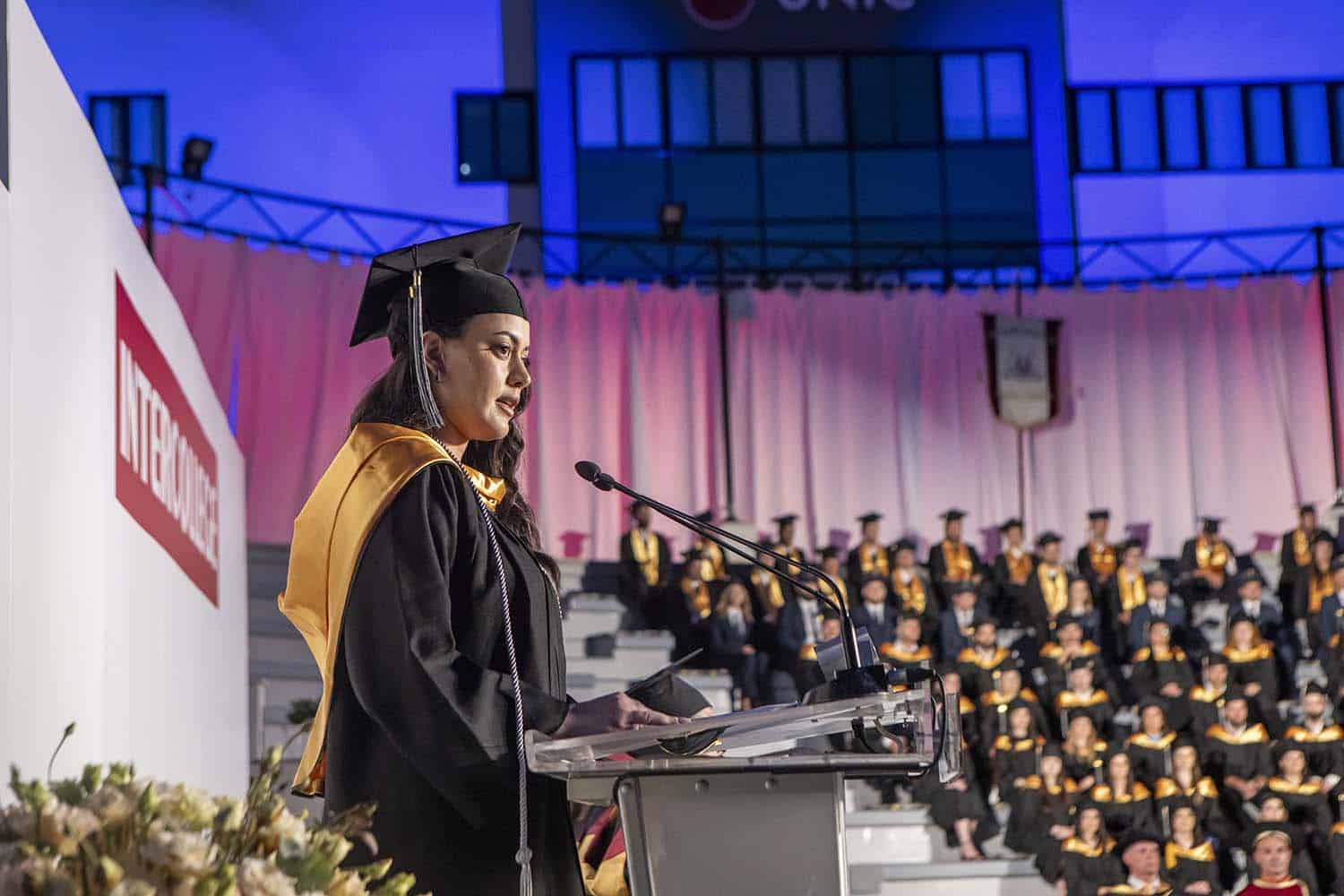 Η Ελένη Ψυλλούρα, μιλώντας εκ μέρους των αποφοίτων, επεσήμανε με νόημα: «Η επιτυχία δεν οριοθετείται. Αυτό πρέπει να το θυμόμαστε πάντα. Τα όρια τα θέτουμε εμείς οι ίδιοι. Μην σταματάτε ποτέ την προσπάθεια για να κάνετε τη διαφορά. Ένα πράγμα που διδαχθήκαμε στα φοιτητικά μας χρόνια είναι ότι οι δυσκολίες και οι αναποδιές δεν πρέπει να μας κρατάνε πίσω. Αντίθετα, θα πρέπει να λειτουργούν ως κίνητρο για την πραγματοποίηση των ονείρων μας. Καμία επιτυχία δεν θα είχε νόημα αν δεν υπήρχε η προσπάθεια και η επιθυμία».