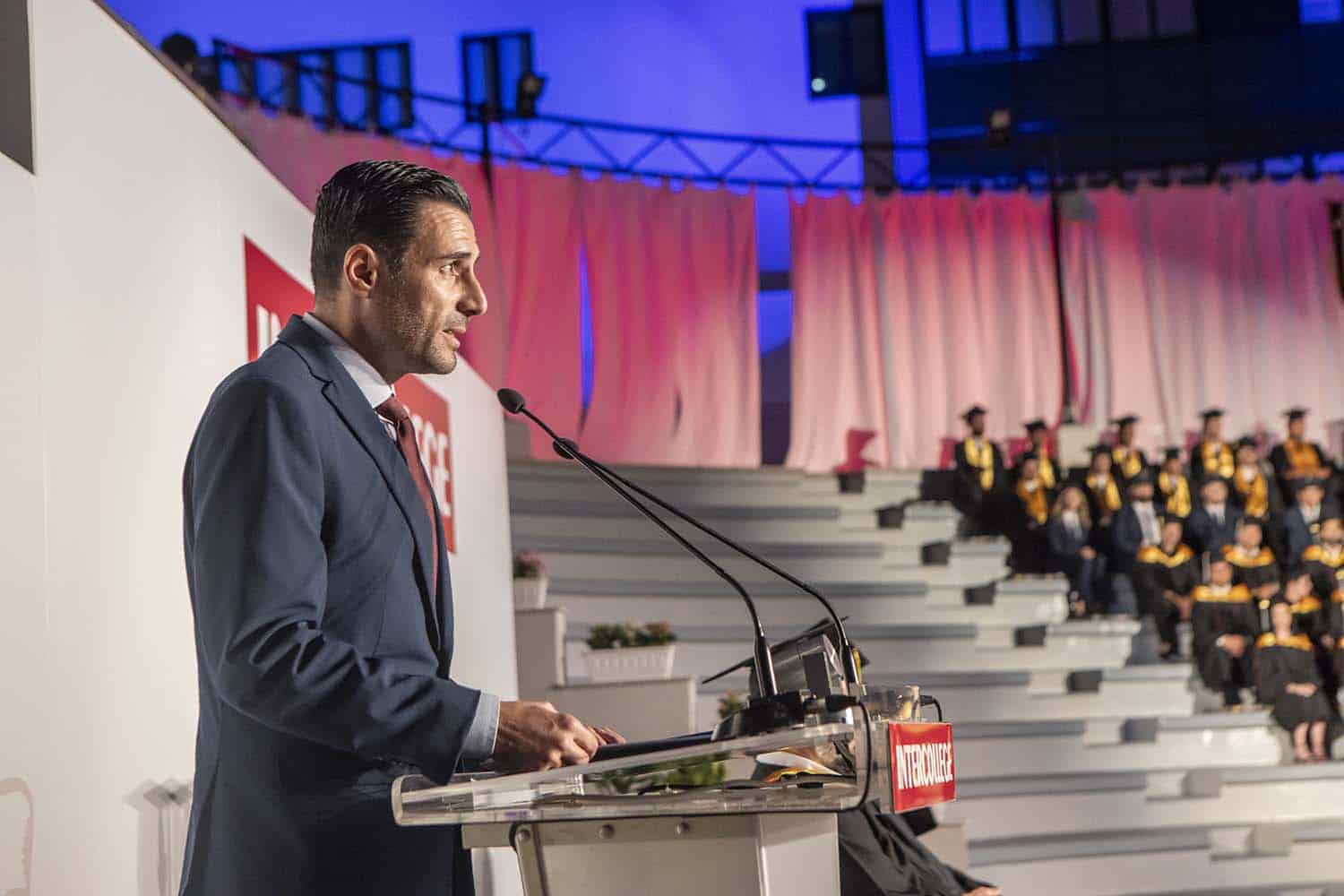 Κύριος ομιλητής της τελετής ήταν ο κ. Φιλόκυπρος Ρουσουνίδης, Γενικός Διευθυντής του Παγκύπριου Συνδέσμου Ξενοδόχων. «Ο τουριστικός τομέας είναι ένας από τους βασικότερους πυλώνες ανάπτυξης της κυπριακής οικονομίας, με σημαντική συμβολή στο ΑΕΠ της χώρας και στην παροχή ευκαιριών εργοδότησης. Ως ΠΑΣΥΞΕ, προσβλέπουμε στην απορρόφηση σημαντικού αριθμού αποφοίτων του ιδρύματος για στελέχωση της ξενοδοχειακής βιομηχανίας. Από σήμερα το ανθρώπινο δυναμικό της Κύπρου εμπλουτίζεται με νέους, καταρτισμένους και εξειδικευμένους επαγγελματίες. Τα εφόδια που αποκομίσατε, οι δεξιότητες που καλλιεργήσατε μέσα από τις σπουδές και τις δραστηριότητές σας, οι εμπειρίες και οι γνώσεις που αποκτήσατε κατά τη διάρκεια της φοίτησής σας στο Intercollege, είμαι σίγουρος θα σας βοηθήσουν στην επίτευξη των στόχων σας».