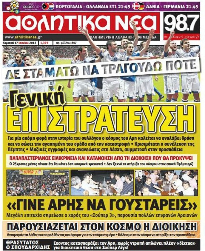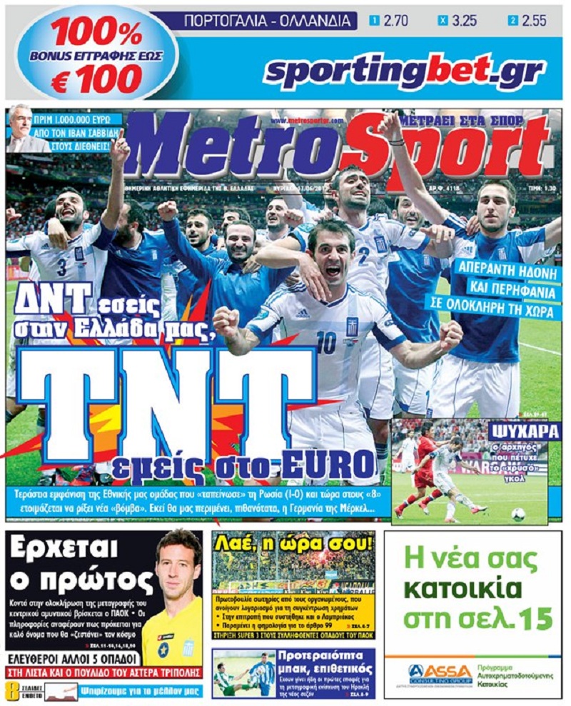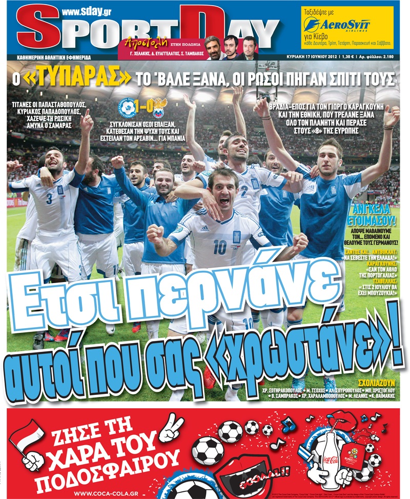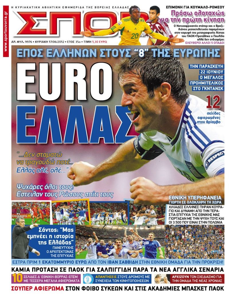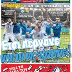 Σπουδαία μέρα η σημερινή, έτσι; Όχι, δεν μιλάμε για τις εκλογές (άλλωστε εκλογές, έτσι όπως πάμε έχουμε… κάθε μήνα!) αλλά για τη χθεσινοβραδινή πρόκριση της Εθνικής μας στους «8» του Euro 2012! Όπως θα περίμενε κανείς όλα τα πρωτοσέλιδα των αθλητικών εφημερίδων σήμερα έχουν γαλανόλευκες αποχρώσεις με την εμφάνιση της «επίσημης αγαπημένης» όλων των Ελλήνων να έχει δικαίως τη μερίδα του λέοντος.