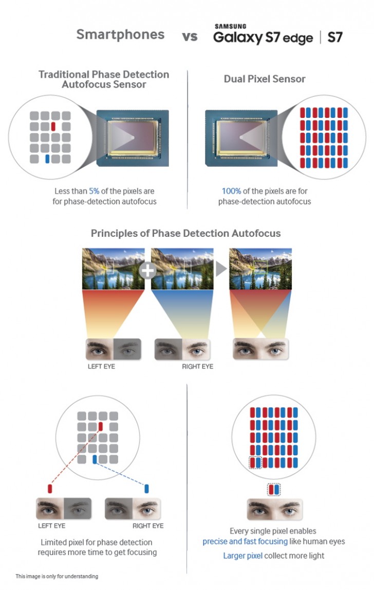 Συγκεκριμένα, ο Dual Pixel Image Sensor που βρίσκεται στην κάμερα των S7/S7 Edge διαχωρίζει κάθε pixel σε δύο φωτοδιόδους για on-chip phase detection κάτι που υπόσχεται βελτιωμένη απόδοση στον τομέα της αυτόματης εστίασης. Η τεχνολογία, που έχει χρησιμοποιηθεί έως τώρα μόνο σε επιλεγμένα high-end DSLR μοντέλα φωτογραφικών μηχανών, στέλνει φως από το φακό σε δύο αισθητήρες εικόνας χωριστά για να ρυθμίσει την εστίαση όπως ακριβώς το κάνει το ανθρώπινο μάτι. Το αποτέλεσμα είναι πολύ περισσότερα pixels εστιασμένα σωστά σε σύγκριση με άλλα smartphones όπως βλέπετε και στο παραπάνω infographic.