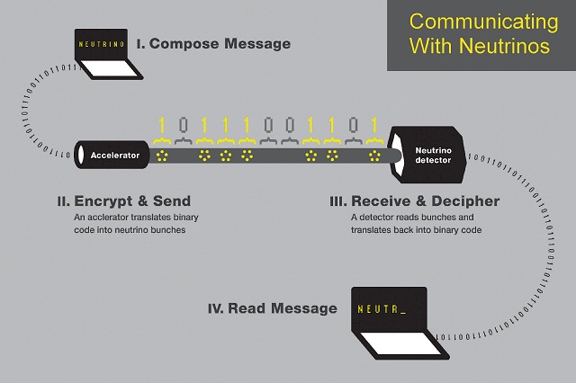 Μια ομάδα επιστημόνων με επικεφαλής ερευνητές από τα Πανεπιστήμια του Rochester στη Νέα Υόρκη και της Βόρειας Καρολίνας κατάφεραν για πρώτη φορά να στείλουν ένα μήνυμα χρησιμοποιώντας μια δέσμη νετρίνων – σωματιδίων σχεδόν χωρίς καθόλου μάζα που ταξιδεύουν με την ταχύτητα περίπου του φωτός. Το μήνυμα εστάλη μέσα από ένα βράχο πάχους 240 μέτρων και έλεγε απλά τη λέξη… “νετρίνο.”